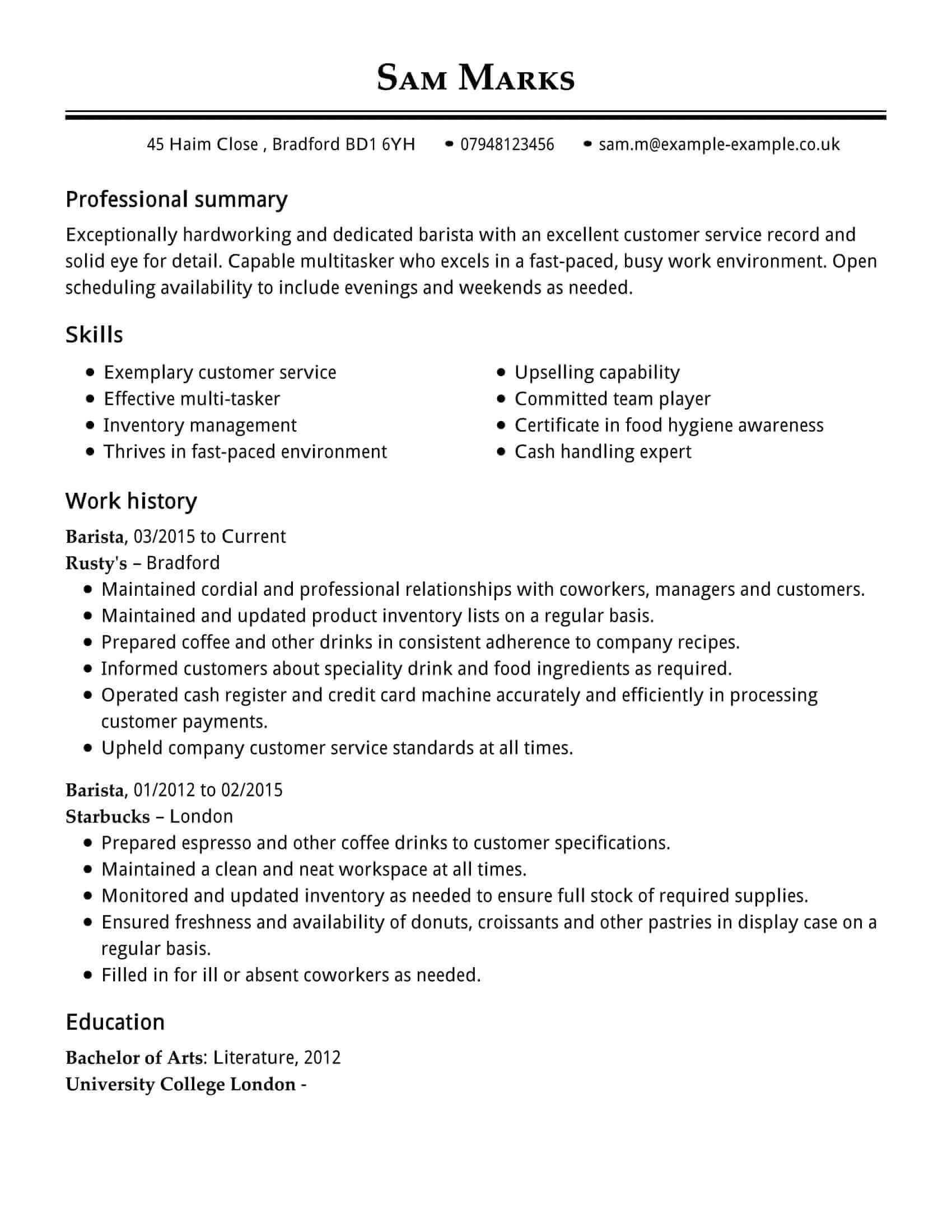 - Write in the third person (e.g., “A passionate and efficient barista with strong customer service skills”), though the first person (“I am an enthusiastic barista”) is also acceptable as long as you stay consistent with the tense.